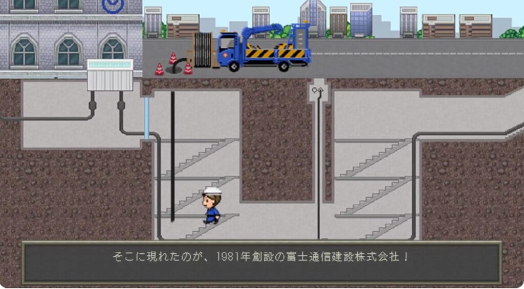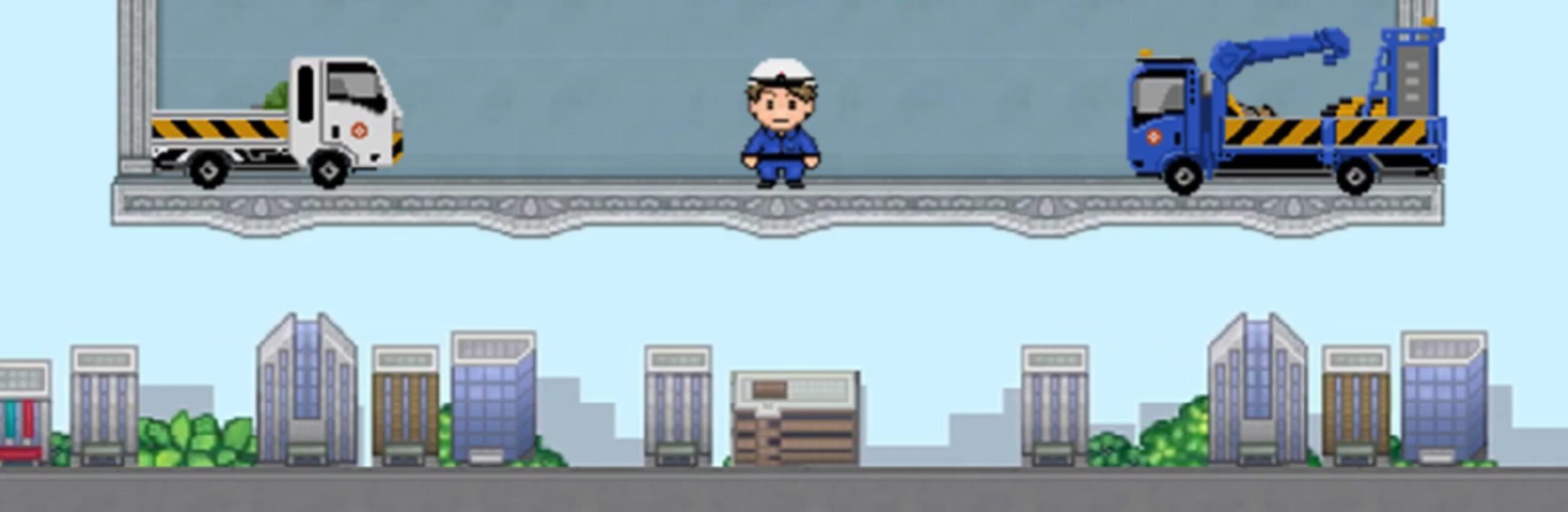 キャラクターや工事車両などをドット絵で表現し、ナレーションを使わずにRPGゲームのような世界観で展開。
