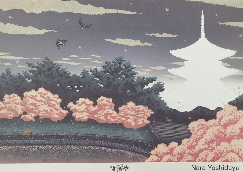 奈良の名所である興福寺の五重塔を中心に、猿沢池、奈良の鹿、桜といった風景を織り交ぜ、旅館が誇る奈良の魅力を掛紙に落とし込みました。